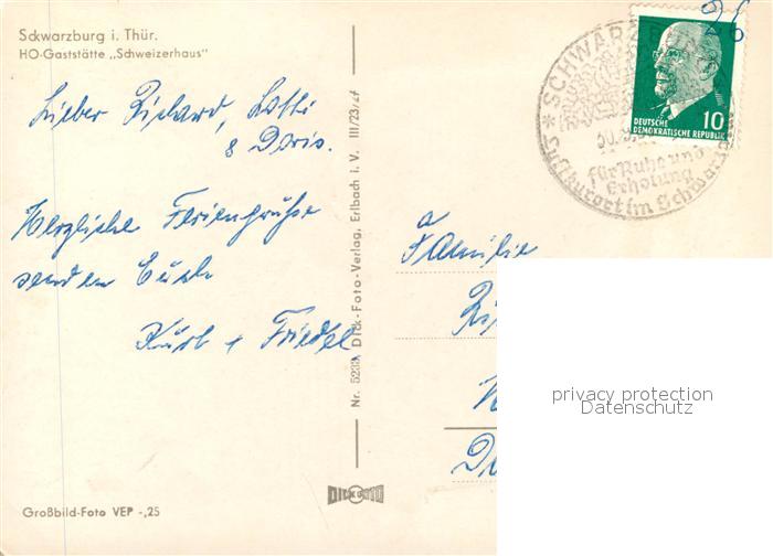 72951635 alte Postkarte Schwarzburg Thueringer Wald HO Gaststaette Schweizerhaus Terrasse postalisch gelaufen Erhaltung siehe scans [FriedD77] KatCode: 11110016073082