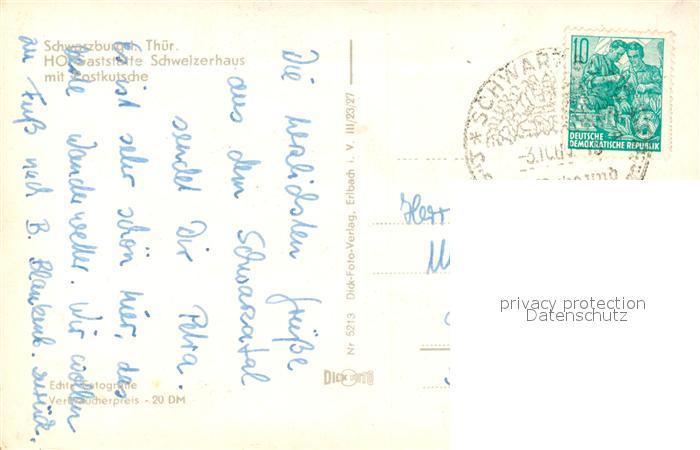 73065421 alte Postkarte Schwarzburg Thueringer Wald HOG Schweizerhof mit Postkutsche postalisch gelaufen Erhaltung siehe scans [WerneD78] KatCode: 11110016073082