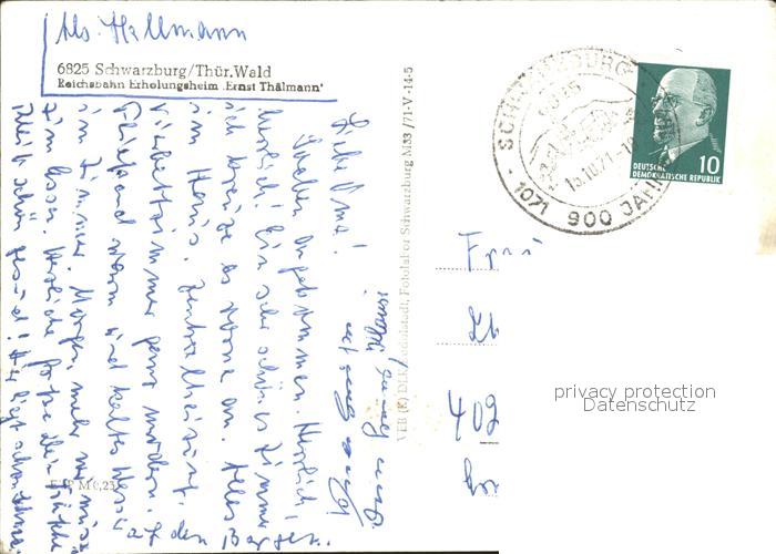 72168860 alte Postkarte Schwarzburg Thueringer Wald Reichsbahn Erholungsheim Ernst Thaelmann postalisch gelaufen Erhaltung siehe scans KatCode: 11110016073082