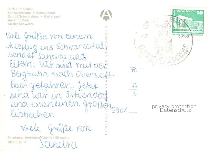 72972854 alte Postkarte Schwarzburg Thueringer Wald Schloss Kaisersaal Schweizerhaus Schwarzatal Trippstein Schwarza postalisch gelaufen Erhaltung siehe scans [FriedD77] KatCode: 11110016073082