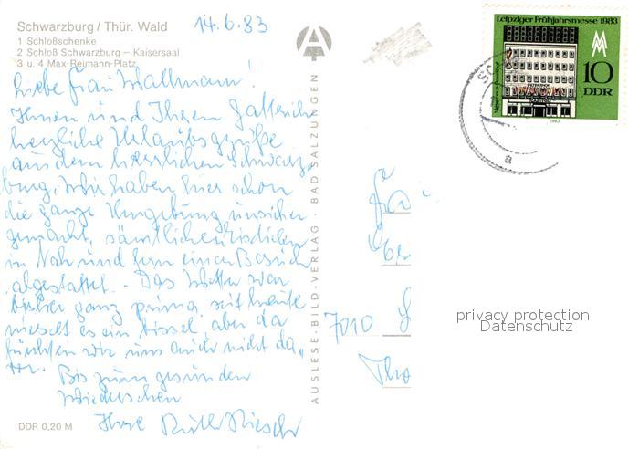 72948666 alte Postkarte Schwarzburg Thueringer Wald Schlossschenke Schwarzburg Max-Reimann-Platz postalisch gelaufen Erhaltung siehe scans [NatalD47] KatCode: 11110016073082