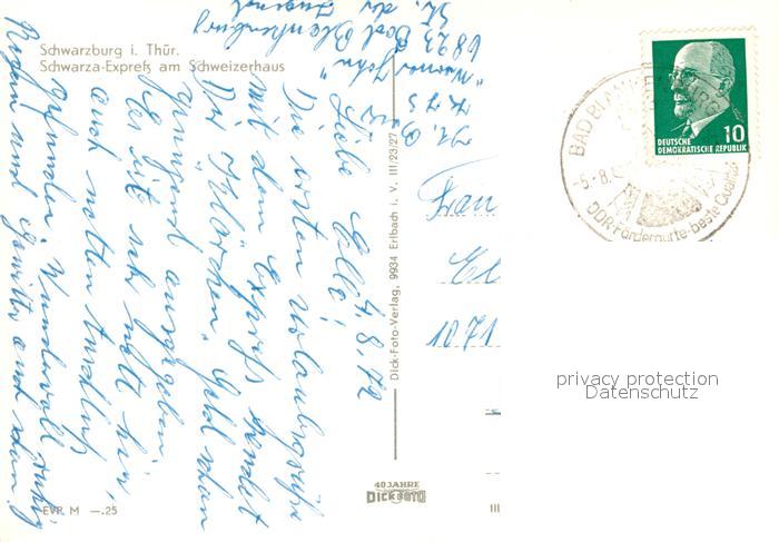 73209413 alte Postkarte Schwarzburg Thueringer Wald Schwarza Express am Schweizerhaus postalisch gelaufen Erhaltung siehe scans [FriedD77] KatCode: 11110016073082