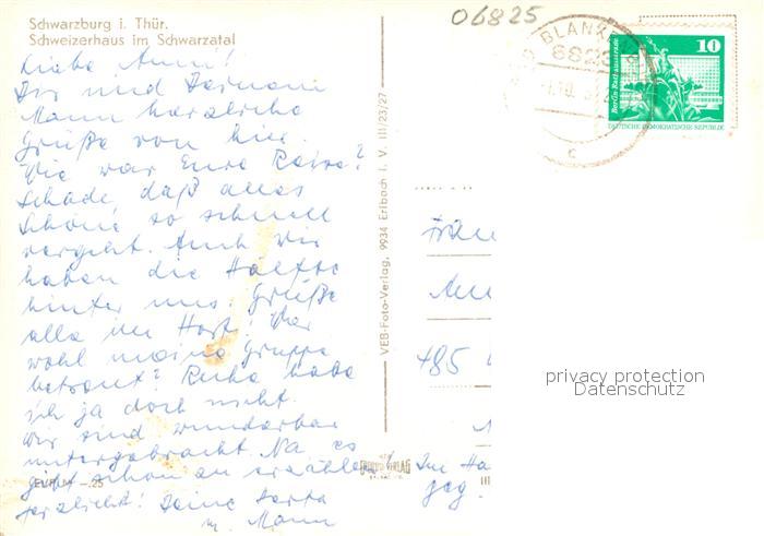 72938503 alte Postkarte Schwarzburg Thueringer Wald Schweizerhaus postalisch gelaufen Erhaltung siehe scans [NatalD47] KatCode: 11110016073082