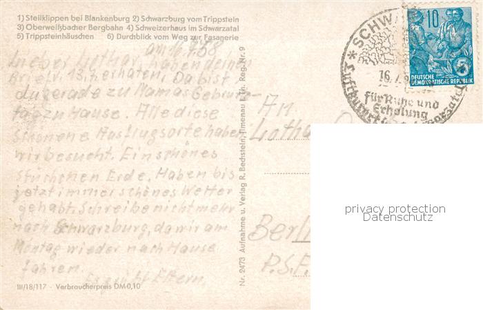 73751145 alte Postkarte Schwarzburg Thueringer Wald Steilklippen Schwarzburg Trippstein Oberweissbacher Bergbahn Schweizerhaus Trippsteinhaeuschen Weg zur Fasanerie postalisch gelaufen Erhaltung siehe scans [WerneD78] KatCode: 11110016073082