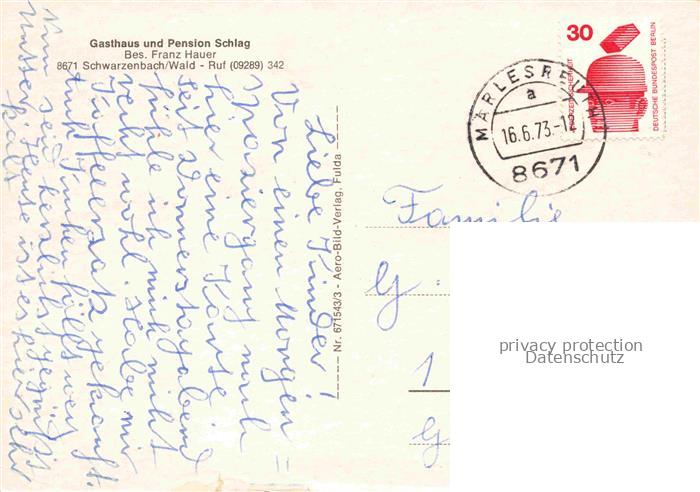 74091453 alte Postkarte Schwarzenbach am Wald Gasthaus Pension Schlag Panorama Terrasse postalisch gelaufen Erhaltung siehe scans [WerneD78] KatCode: 11110009475169