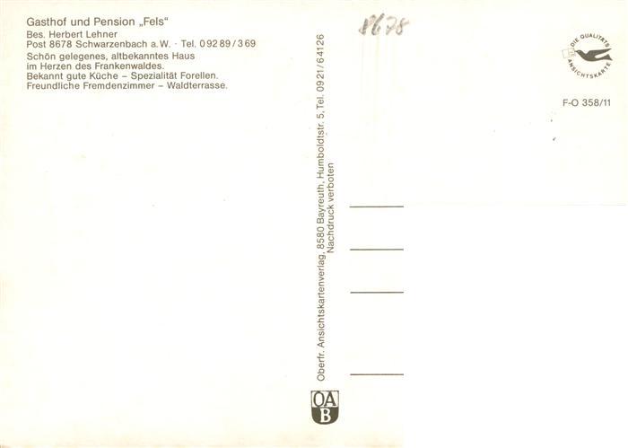 73914674 Schwarzenbach am Wald Gasthof Pension Fels Gastraeume Panorama postalisch gelaufen Erhaltung siehe scans [WerneD78] alte Postkarte Wern Katcode 11110009475169