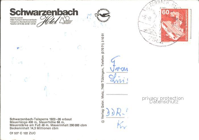 72497032 alte Postkarte Schwarzenbach Forbach Hotel an der Talsperre Stausee Schwarzwald postalisch gelaufen Erhaltung siehe scans KatCode: 11110008216013