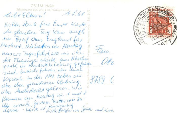 73890446 alte Postkarte Schwarzenbach Wald CVJM Heim postalisch gelaufen Erhaltung siehe scans [FriedD77] KatCode: 11110009475169