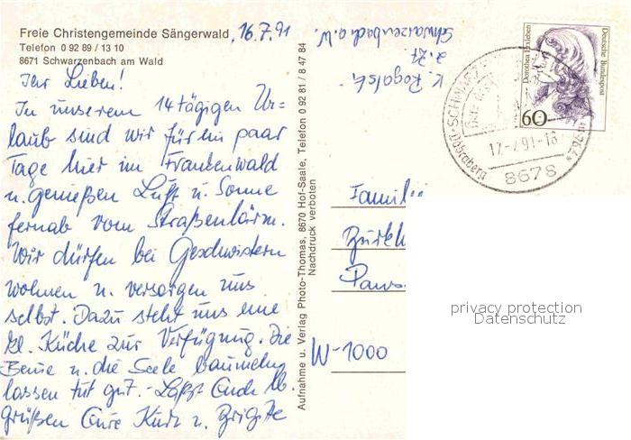 72825297 alte Postkarte Schwarzenbach Wald Freie Christengemeinde Saengerwald postalisch gelaufen Erhaltung siehe scans [AndreD76] KatCode: 11110009475169