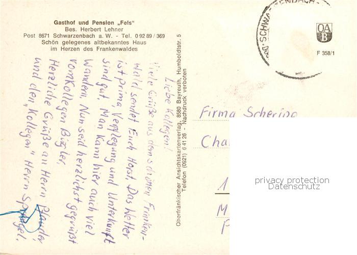 73845524 alte Postkarte Schwarzenbach Wald Gasthof Pension Fels postalisch gelaufen Erhaltung siehe scans [WerneD78] KatCode: 11110009475169