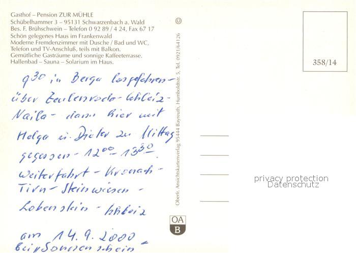 73687441 Schwarzenbach Wald Gasthof Pension Zur Muehle postalisch nicht gelaufen Erhaltung siehe scans [FriedD77] KatCode: 11110009475169