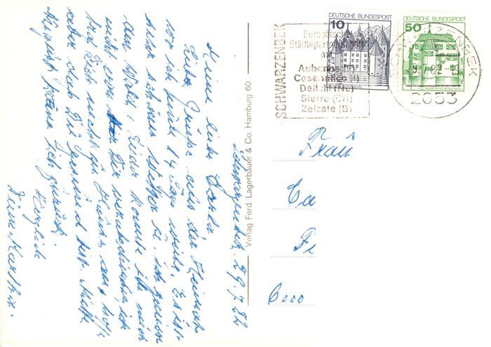 73888785 alte Postkarte Schwarzenbek Strassenpartien Schloss Siedlung Franziskus Kirche Amtsrichterhaus postalisch gelaufen Erhaltung siehe scans [FriedD77] KatCode: 11110001053116