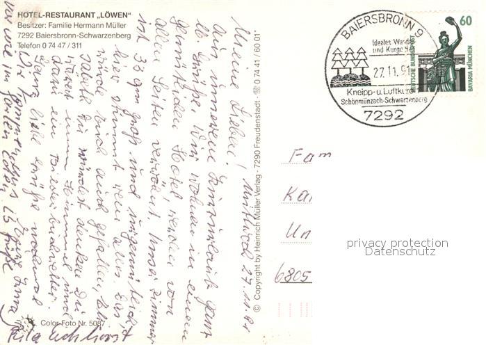 73070640 alte Postkarte Schwarzenberg Baiersbronn Hotel Restaurant Loewen im Schwarzwald postalisch gelaufen Erhaltung siehe scans [FriedD77] KatCode: 11110008237004