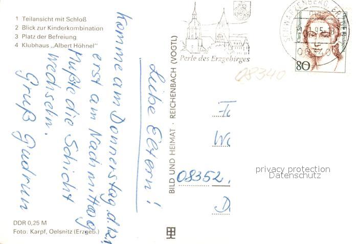 73567129 alte Postkarte Schwarzenberg Erzgebirge Ansicht mit Schloss Kinderkombination Plattenbauten Platz der Befreiung Klubhaus Albert Hoehnel postalisch gelaufen Erhaltung siehe scans [FriedD77] KatCode: 11110014191300