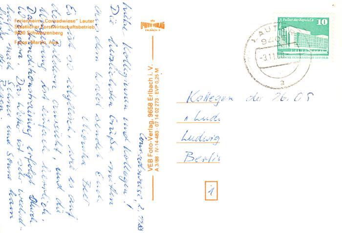 73924033 Schwarzenberg Erzgebirge Ferienheim Conradwiese Lauter Gastraeume postalisch gelaufen Erhaltung siehe scans [WerneD78] alte Postkarte Wern Katcode 11110014191300