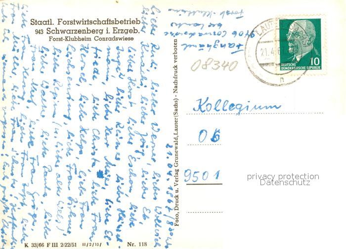 73565507 alte Postkarte Schwarzenberg Erzgebirge Forst Klubheim Conradswiese postalisch gelaufen Erhaltung siehe scans [FriedD77] KatCode: 11110014191300
