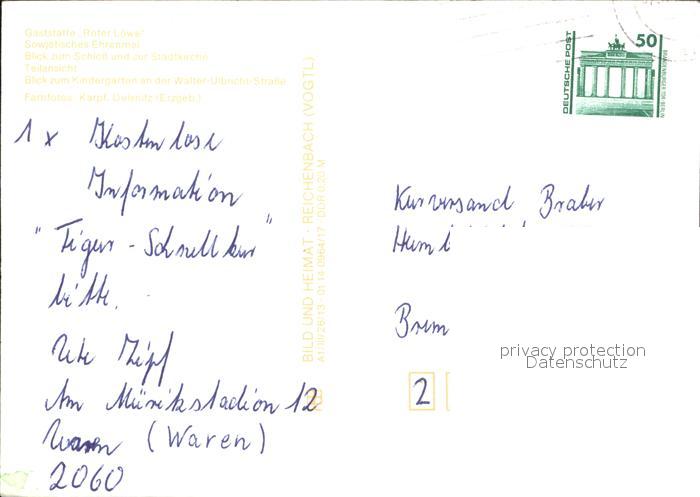 72261855 alte Postkarte Schwarzenberg Erzgebirge Gaststaette Roter Loewe Sowjetisches Ehrenmal Schloss Stadtkirche Kindergarten postalisch gelaufen Erhaltung siehe scans KatCode: 11110014191300