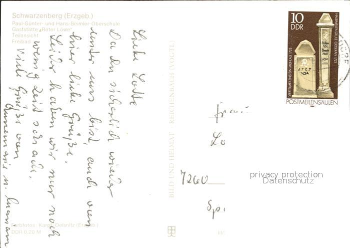 72375667 alte Postkarte Schwarzenberg Erzgebirge Paul Guenter und Hans Beimler Oberschule Freibad postalisch gelaufen Erhaltung siehe scans KatCode: 11110014191300