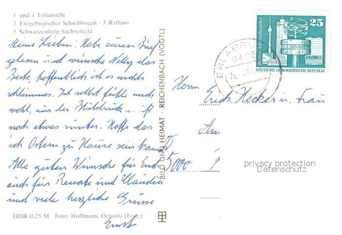 73669595 alte Postkarte Schwarzenberg Erzgebirge Teilansicht Erzgebirgischer Schwibbogen Rathaus Sachsenfeld postalisch gelaufen Erhaltung siehe scans [FriedD77] KatCode: 11110014191300