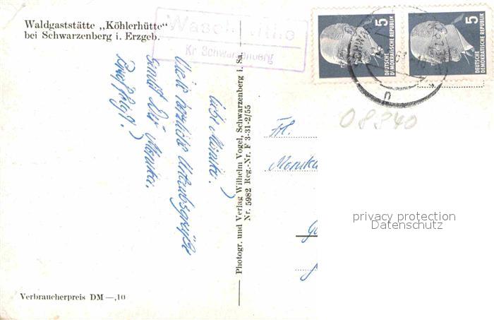 72641875 alte Postkarte Schwarzenberg Erzgebirge Waldgaststaette Koehlerhuette postalisch gelaufen Erhaltung siehe scans [AndreD76] KatCode: 11110014191300