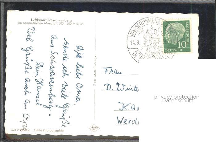 71906976 alte Postkarte Schwarzenberg Murgtal Teilansicht Kirche postalisch gelaufen Erhaltung siehe scans KatCode: 11110008237004