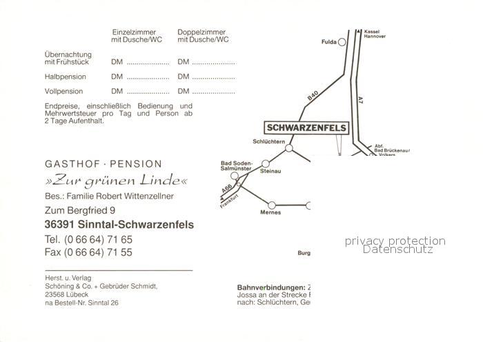 72991296 Schwarzenfels Panorama Gasthof Pension Zur gruenen Linde postalisch nicht gelaufen Werbekarte (keine Postkarte) Erhaltung siehe scans [WerneD78] KatCode: 11110006435027