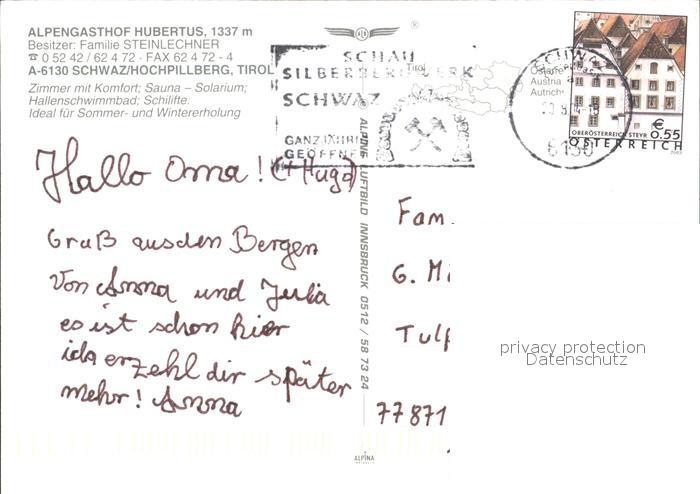 72137994 alte Postkarte Schwaz Tirol Alpenhof Hubertus Hochpillberg Kellerjoch postalisch gelaufen Erhaltung siehe scans KatCode: 11390335070926
