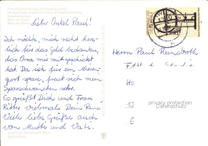 72393525 alte Postkarte Schwedt Franzoesische Kirche Stadtapotheke Kaufhalle Friedrich-Engels-Strasse postalisch gelaufen Erhaltung siehe scans KatCode: 11110012073532