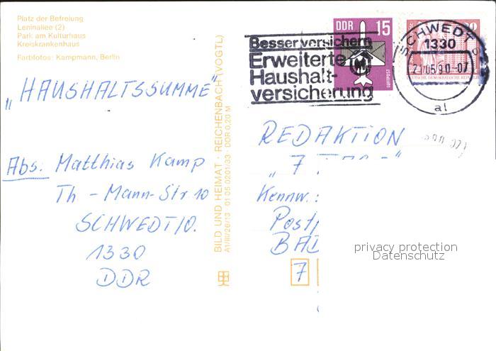72415489 alte Postkarte Schwedt Oder Paltz der Befreiung Leninallee Park Kulturhaus Kreiskrankenhaus postalisch gelaufen Erhaltung siehe scans KatCode: 11110012073532