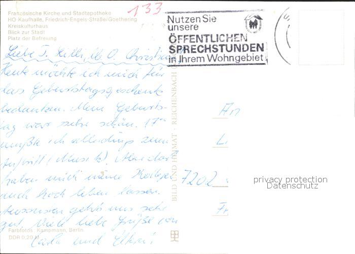72124992 alte Postkarte Schwedt Stadtapotheke Franzoesiche Kirche Kulturhaus postalisch gelaufen Erhaltung siehe scans KatCode: 11110012073532