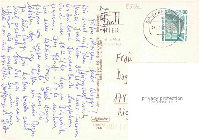 74053409 alte Postkarte Schweich Mosel St. Martin Kirche Innenansicht Heilbrunnen-Kapelle Brunnen Luftaufnahme postalisch gelaufen Erhaltung siehe scans [FriedD77] KatCode: 11110007235125