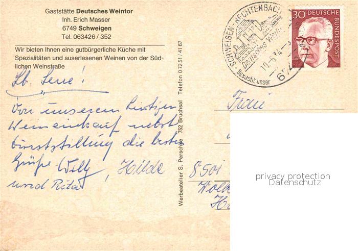 72777306 alte Postkarte Schweigen-Rechtenbach Gaststaette Deutsches Weintor postalisch gelaufen Erhaltung siehe scans [KathaD81] KatCode: 11110007337071