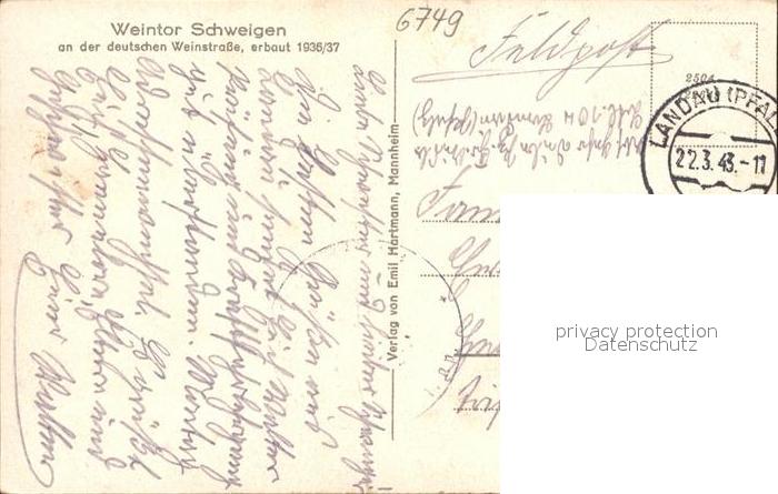 41793078 alte Postkarte Schweigen-Rechtenbach Weintor NZ4 postalisch gelaufen Feldpost Erhaltung siehe scans KatCode: 11110007337071