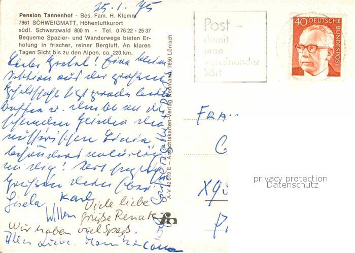72646083 alte Postkarte Schweigmatt Pension Tannenhof Hoehenluftkurort postalisch gelaufen Erhaltung siehe scans [FriedD77] KatCode: 11110008336081