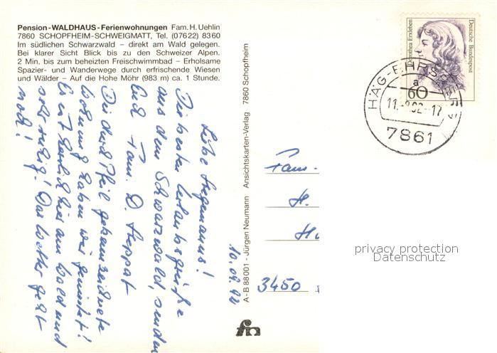 73644604 alte Postkarte Schweigmatt Pension Waldhaus Ferienwohnungen im Schwarzwald postalisch gelaufen Erhaltung siehe scans [FriedD77] KatCode: 11110008336081