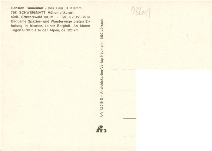 73927585 Schweigmatt Schopfheim Pension Tannenhof postalisch nicht gelaufen Erhaltung siehe scans [WerneD78] KatCode: 11110008336081