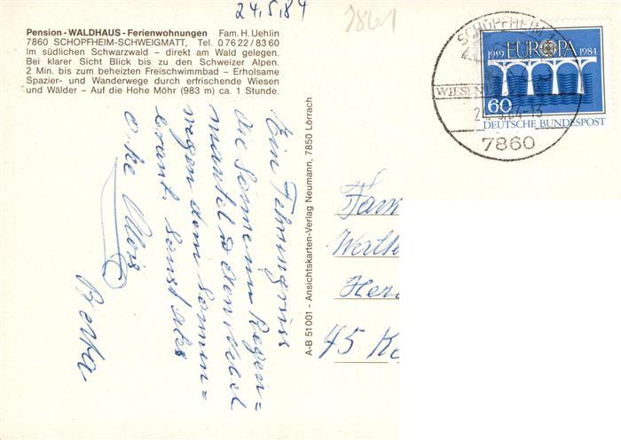 73928250 alte Postkarte Schweigmatt Schopfheim Pension Waldhaus postalisch gelaufen Erhaltung siehe scans [WerneD78] KatCode: 11110008336081