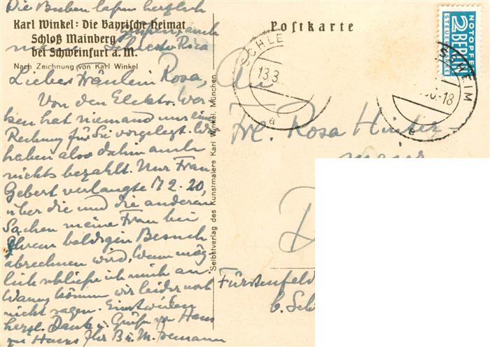 73872182 alte Postkarte Schweinfurt Schloss Mainberg Zeichnung postalisch gelaufen Erhaltung siehe scans [WerneD78] KatCode: 11110009662000