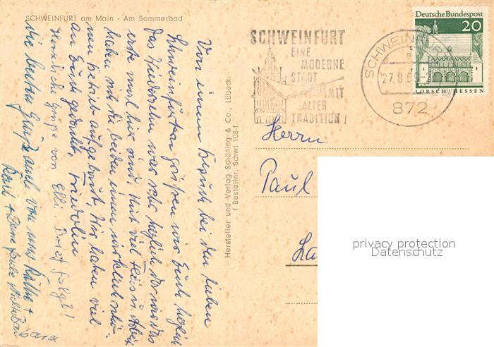 73089336 alte Postkarte Schweinfurt Sommerbad postalisch gelaufen Erhaltung siehe scans [KathaD81] KatCode: 11110009662000