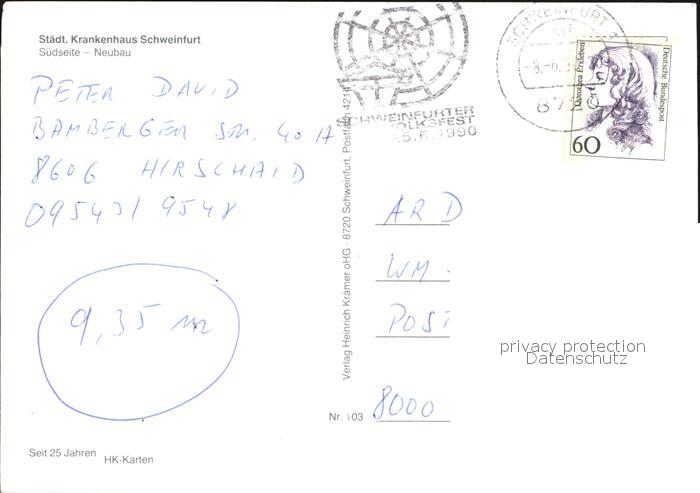 72430679 alte Postkarte Schweinfurt Staedtisches Krankenhaus Neubau postalisch gelaufen Erhaltung siehe scans KatCode: 11110009662000