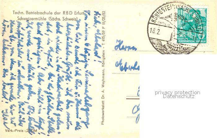 72642942 alte Postkarte Schweizermuehle Saechsische Schweiz Technische Betriebsschule der RBD Erfurt postalisch gelaufen Erhaltung siehe scans [FriedD77] KatCode: 11110014287350