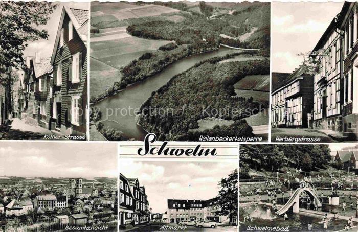 74101275 alte Postkarte Schwelm NRW Koelner Strasse Heilenbeckertalsperre Fliegeraufnahme Herbergstrasse Panorama Altmarkt Schwelmebad postalisch gelaufen Erhaltung siehe scans [WerneD78] KatCode: 11110005954024