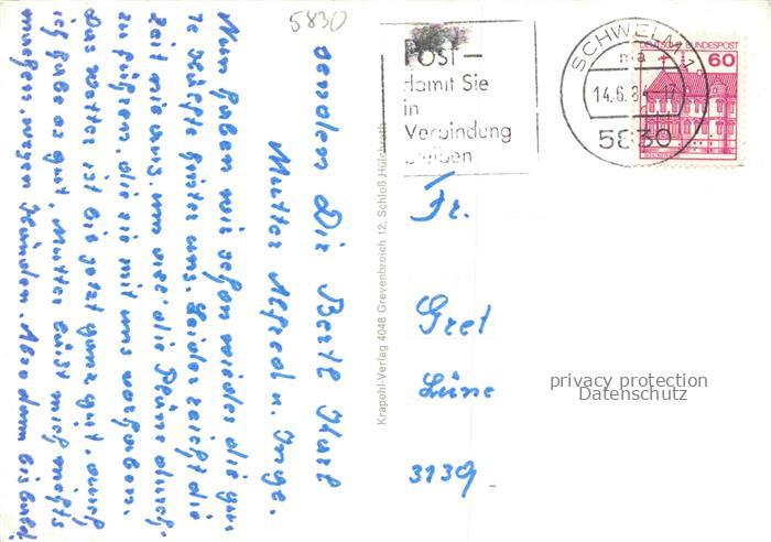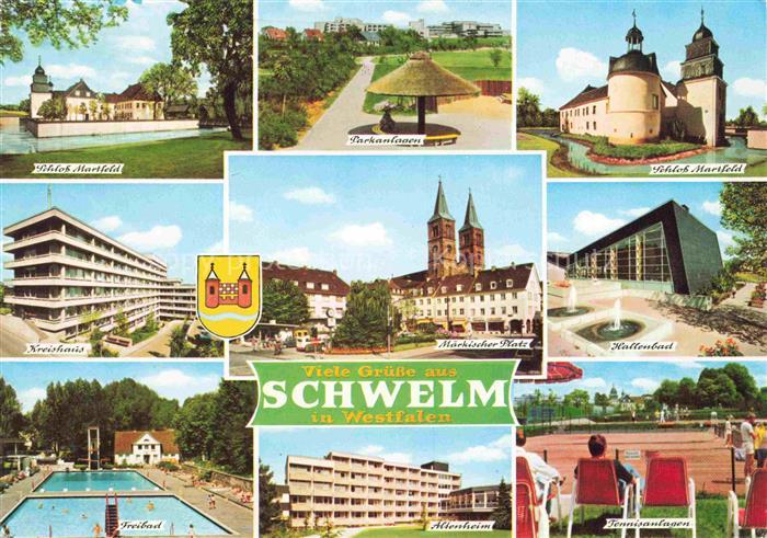 74100663 alte Postkarte Schwelm NRW Schloss Martfeld Kreishaus Freibad Park Maerkischer Platz Altenheim Hallenbad Tennisanlage postalisch gelaufen Erhaltung siehe scans [WerneD78] KatCode: 11110005954024