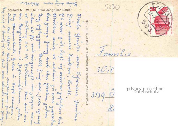 74100665 alte Postkarte Schwelm NRW Strandbad Maerkischer Platz Panorama Altstadt St Marien Schloss Martfeld Altenmarkt Christus Kirche postalisch gelaufen Erhaltung siehe scans [WerneD78] KatCode: 11110005954024