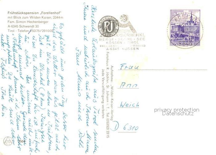 73227070 alte Postkarte Schwendt Pension Forellenhof Blick zum Wilden Kaiser Kaisergebirge postalisch gelaufen Erhaltung siehe scans [FriedD77] KatCode: 11390335070418
