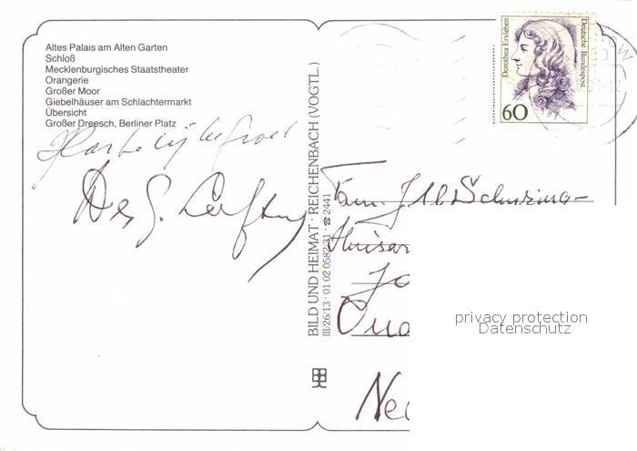 72655730 alte Postkarte Schwerin Mecklenburg Altes-Palais am Alten Garten Schloss Staatstheater Orangerie Schlachtermarkt Berliner-Platz Grosser-Dreesch postalisch gelaufen Erhaltung siehe scans [LiesaD40] KatCode: 11110013004000