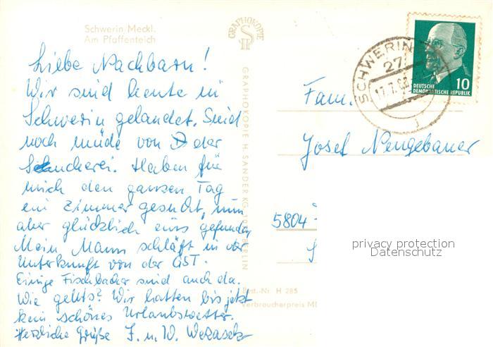 73722869 alte Postkarte Schwerin Mecklenburg Am Pfaffenteich postalisch gelaufen Erhaltung siehe scans [WerneD78] KatCode: 11110013004000