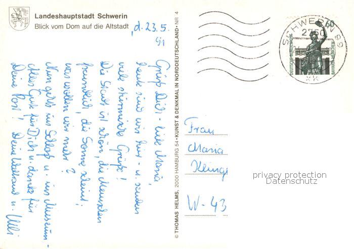 73643642 alte Postkarte Schwerin Mecklenburg Blick vom Domauf die Altstadt postalisch gelaufen Erhaltung siehe scans [WerneD78] KatCode: 11110013004000