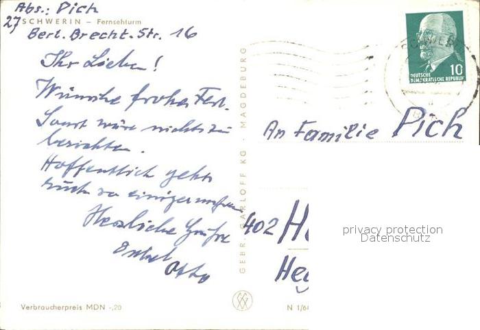 72232782 alte Postkarte Schwerin Mecklenburg Fernsehturm postalisch gelaufen Erhaltung siehe scans KatCode: 11110013004000
