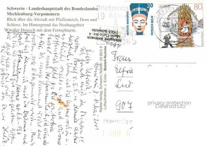 72840236 alte Postkarte Schwerin Mecklenburg Fliegeraufnahme Altstadt Pfaffenteich Dom Schloss postalisch gelaufen Erhaltung siehe scans [WerneD78] KatCode: 11110013004000